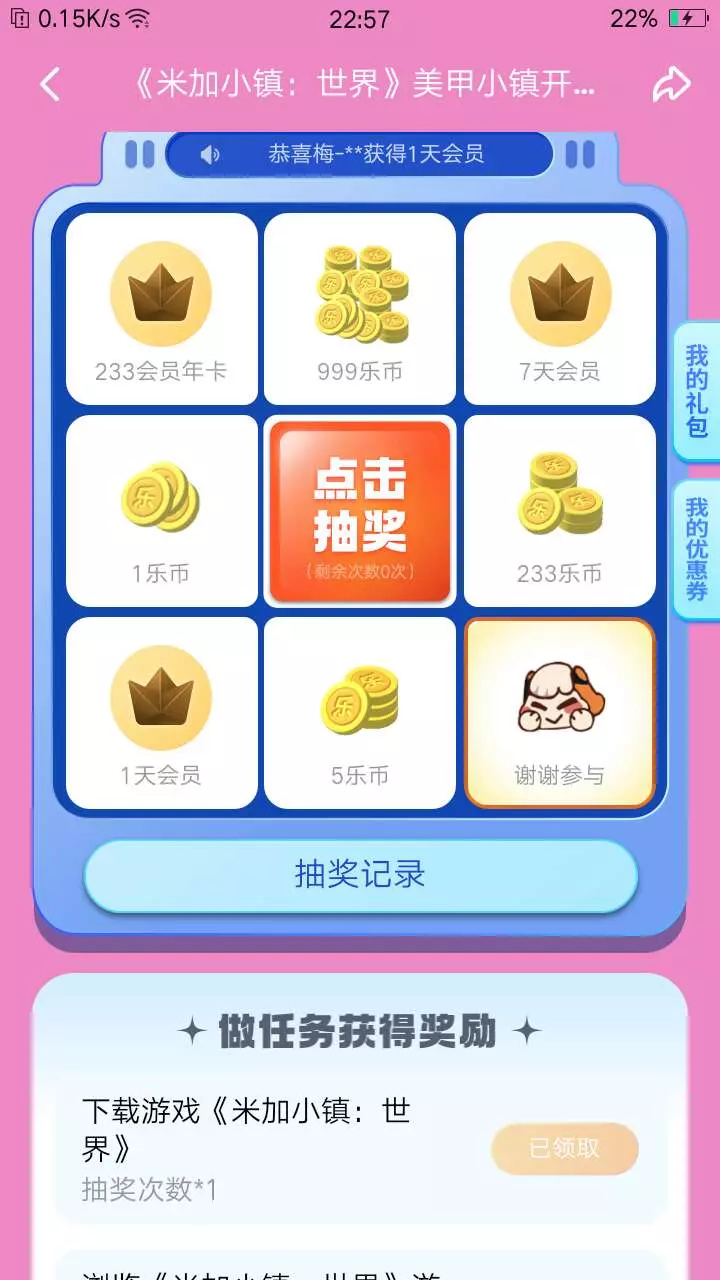 家人们,我也是真的无语了,好吧?我领了所有的这些抽奖次数最后一个乐园币。其他的都是没有中。也真是到无语了极点了,好吧?我想问一下别人是怎么抽到一天的那个会员卡的?在线求助。😭😭😭😭