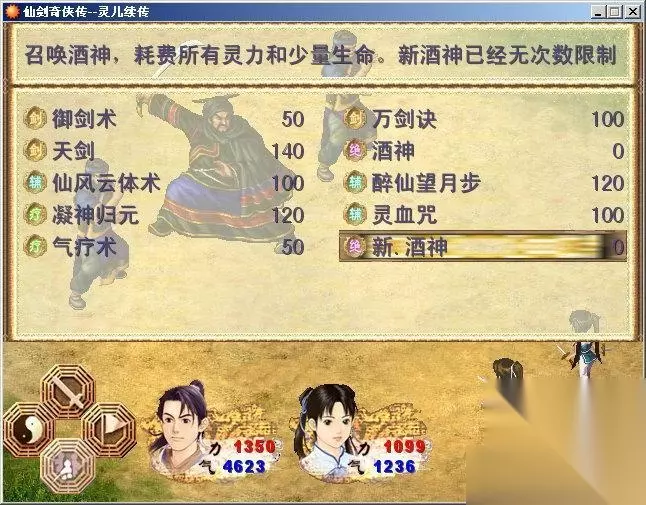 酒神策略,11级时候的李逍遥(实际上浪费了一些钱,本来真气还能更高) 六、仙灵岛上,李逍遥和灵儿共度一晚。灵儿陷入内心的自我争战中,逍遥知道这是恢复记忆的前兆,只是让她自己抉择。次日又碰到苗疆拜日教的人,逍遥终于察觉出来事有蹊跷,返回圣姑那里。次日,二人前往锁妖塔。流程概述:1、前往仙灵岛2、进入水月宫3、使用“传送符”返回圣姑那里4、和圣姑对话战斗指南:就一战,酒神策略的话,一回合就搞定了。其他指南:1、前往洗澡的地方,能够有一小段回忆2、金蝉王策略:返回圣姑那里之后,不理圣姑,直接去南诏购买蛊。这样应该可以炼数个金蝉王了,暂时不吃。相关截图:
