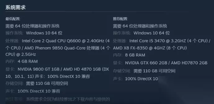 配置要求一览 最低配置: 操作系统:Windows 10 处理器:i5-2700K / AMD FX-6300 显卡:GTX 760 2GB / AMD Radeon R9 280 3GB 内存:8 GB 硬盘空间:45 GB