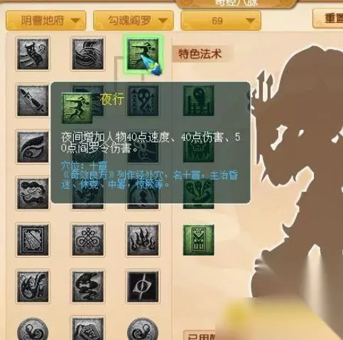 2.经脉:推荐点夜行,它可以夜间增加人物40点速度、40点伤害、50点阎罗令伤害。对地府的提升很大。
