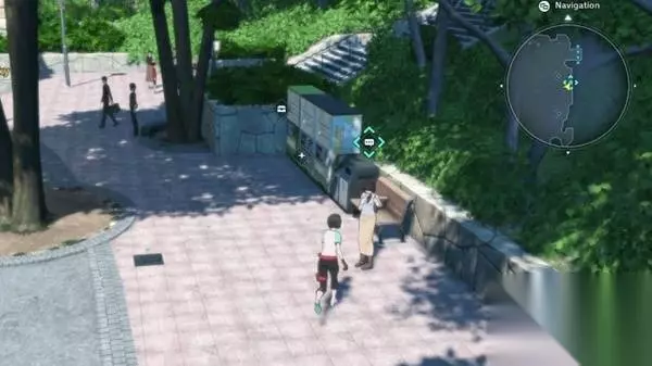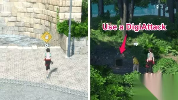 2.与母亲交谈后,与标记的斑点互动以寻找痕迹。然后,走楼梯前往社区森林,对空地上的盒子使用数码攻击。