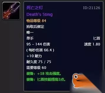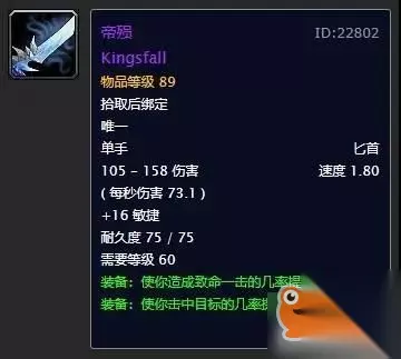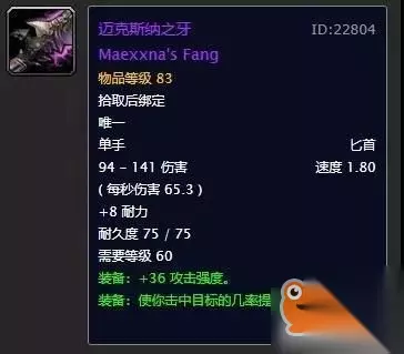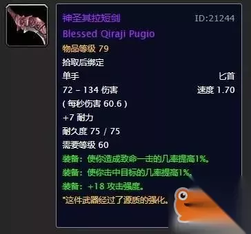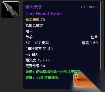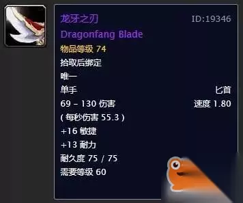 熔火犬牙出自mc老9的箱子,放在目前阶段来看获取难度并不是很高,不过也有一定的竞争力就是。这把匕首的面板属性非常完美,唯一美中不足的就是攻速仅有1.60,所以放在副手位置更加合适。建议有条件的玩家都去争取一下,最起码能够用到naxx开放。 第九名:龙牙之刃