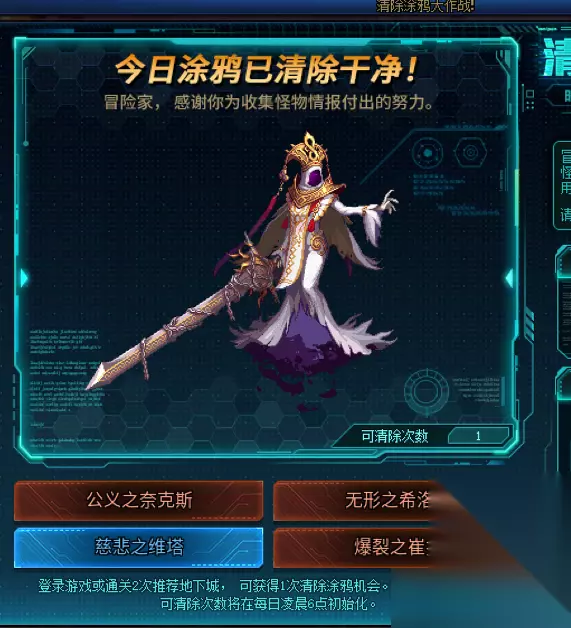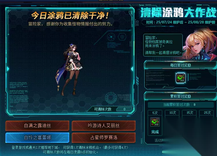 DNF的“清除涂鸦大作战”活动正在火热进行中,丰厚奖励等你拿。每日登录游戏或通关2次推荐地下城,就能获得清除涂鸦次数,每次清除后可答题,答对可得5个深渊入场券,累积答对更有传说装备自选礼盒。为助力大家轻松拿奖,本页面将实时更新每日答案,助你快速解锁奖励 。 DNF端游清除涂鸦大作战每日答案分享(实时更新) 7-31答案:自怜之塞蕾娜