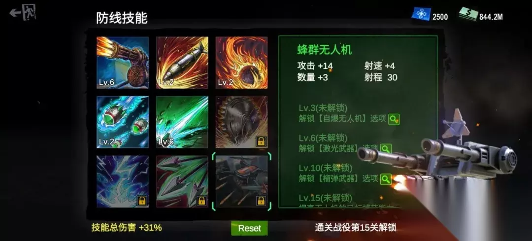 图片仅供参考 --------------------防线技能----------------------------- 僵尸防线玩法中最重要的提升手段,防线技能分9大类,每类通过升级解锁新的特性,共有120+技能可供搭配,游戏过程不断解锁新地图,不同的道路选择将带来与众不同的游戏体验,各个技能均有其特点,在众多路线进行选择,将由你来决定如何走下去,寻找胜利的不二法门!