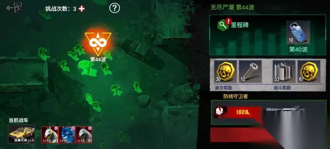 图片仅供参考 无尽尸潮玩法在战役第四关通过后解锁,每天有3次免费挑战机会。尸潮会保存最新的进度,重新进入后从最新波次继续挑战但难度会降低,并且重新选择开场技能。