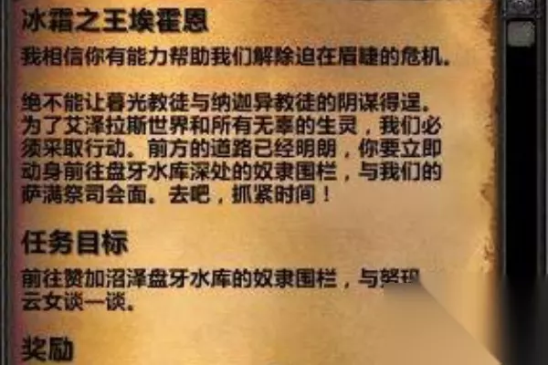 6、通知长老 返回主城,找到大地之环长老并将图腾信物转交给他。 7、冰霜之王埃霍恩 前往奴隶围栏,找到并击败冰霜之王埃霍恩。
