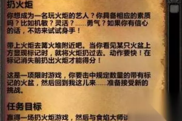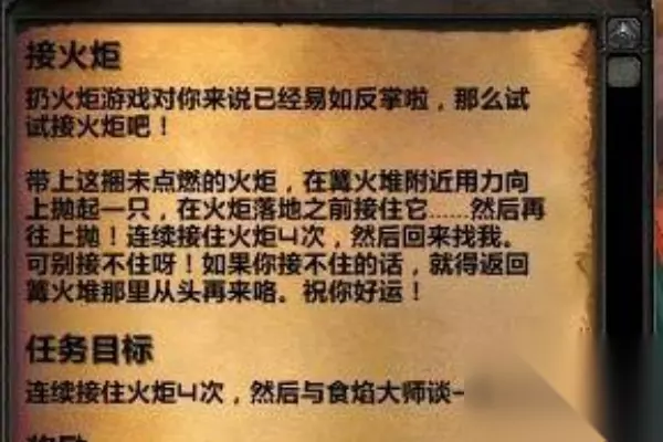 前往篝火旁并把火炬抛出去并接住,完成4次即可。