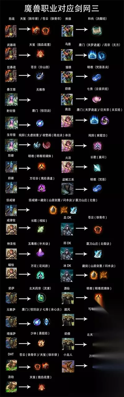 1、战士: ①防战=天策(铁牢律)/苍云(铁骨衣) ②武器战=天策(傲血战意) ③狂暴战=苍云(分山劲) 2、德鲁伊: ①熊德=和尚(洗髓经) ②鸟德=唐门(天罗诡道) /药宗(无方) ③猫德=明教(焚影圣决) ④奶德=七秀(云裳衣经) 3、猎人: ①兽王猎=无推荐 ②射击猎=唐门 (惊羽诀) ③生存猎=纯阳(太虚剑意)/凌雪阁(隐龙决) 4、法师: ①冰法=纯阳(紫霞功) ②奥法=唐门(天罗诡道 )/衍天宗(太玄经) ③火法=长歌(莫问) 5、圣骑士: ①防骑=明教(明尊琉璃体) ②奶骑=万花谷(离经易道) ③惩戒骑=藏剑(山居剑意/问水决)/霸刀山庄(北傲) 6、盗贼: ①盗贼三系=明教(焚影) 7、牧师: ①戒律牧=长歌(相知) ②神圣牧=五毒教(补天诀) ③暗牧=万花(花间游) 8、萨满: ①奶萨=北天药宗(灵素) ②元素萨=唐门(惊羽诀)/七秀(冰心诀)踏风 ③增强萨=少林(易筋经) 9、恶魔猎手: ①DHT=苍云(铁骨衣)/天策(铁牢律) ②浩劫=天策(傲血战意) 10、死亡骑士: ①血DK=苍云(铁骨衣) ②邪DK=霸刀山庄(北傲诀) ③冰DK=藏剑(山居剑意/问水诀) 11、武僧: ①酒仙=明教(明尊琉璃体) ②踏风=丐帮(笑尘诀) ③奶僧=北天药宗(灵素) 12、龙希尔=刀宗(孤锋诀)