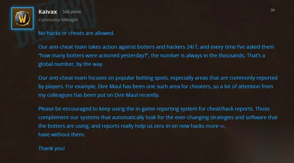 其实暴雪这么做主要是针对工作室的脚本,虽然,现在很少能听到脚本的消息,并不代表脚本已经消失。恰恰相反,脚本只是越来越隐蔽,远离大家的视野,但是,暴雪的数据对脚本还是了如指掌的。由此也可以说明,暴雪对脚本的打击从来没有停止过。