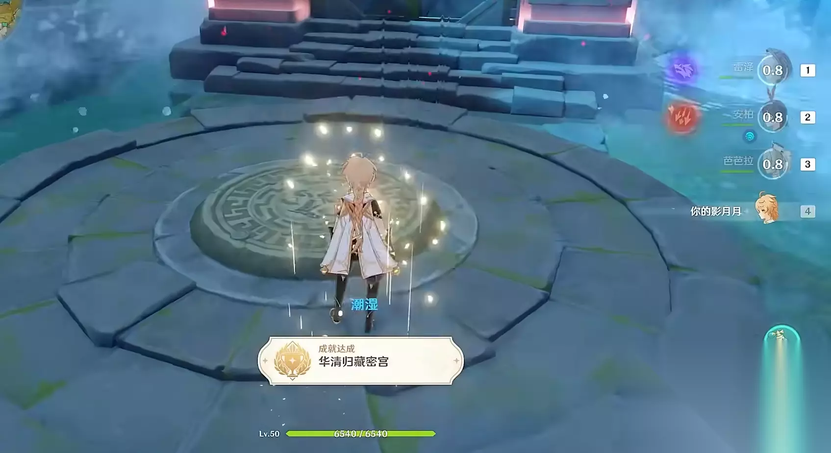 不过方碑的顺序并不是按照他们的排列顺序来的,如果单纯全部点亮并不能解开这个机关,而是会陷入锁定状态,这个时候去开关那里进行互动就能重置到初始状态了。调查遗迹能有“循长者之迹”这样的提示,再仔细观察每个方碑的上方,可以看到它们后面都有或长或短的石柱立在后面。这个时候就能发现它们的规律是什么,按照中左右的顺序把最长的点亮, 再把两边最短的点亮之后蓝色屏障就会消失,显示出下面副本的大门。后面直接跳下去就可以了,还能顺带完成华清归藏密室的成就,领到5个原石。