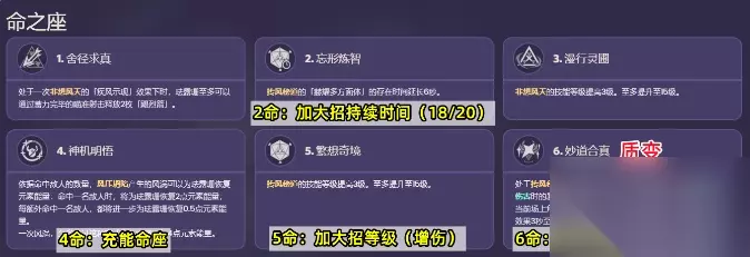 命座分析 珐露珊一命是一轮E可以连续释放2枚飓烈箭,但风涡产球的CD依然存在,对充能帮助不大。二命是延长大招持续时间6秒,延长后大招持续18秒CD20秒,大招不间断的前提下覆盖率从60%提升到90%。三命加战技等级。四命是充能命座,一次风涡可以最多额外为珐露珊回复4点能量。五命加大招等级,前面说过增伤幅度和大招等级挂钩,所以五命对珐露珊的辅助能力也有提升。