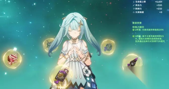 至于官方角色演示里出现的绝弦,还有一众输出弓等,不是说不能用,但更适合输出/主C路线使用;这一次介绍的培养思路主要还是以更为泛用的风辅路线为主,圣遗物、配队同理。 圣遗物选择 “遇事不决绝缘套”,既然珐露珊需要充能,绝缘套就能派上用场了。如果不在意伤害,圣遗物最低要求只需要2绝缘搭配任意散件(或者2流放者)加充能沙即可。当然个人还是更推荐4绝缘,毕竟珐露珊大招倍率不低。