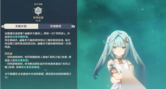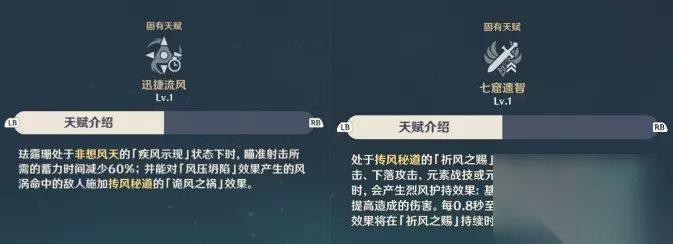 由于大招增加风伤的效果会随大招等级提升,1级18%,到了8级就有28.8%;且元素战技的风涡减抗数值不随等级变化,所以珐露珊作为风辅使用的话,只需要升级大招即可。 然后是两个战斗天赋,第一个“迅捷流风”在分析元素战技时已经介绍完了,就是减少“飓烈箭”的蓄力时间和给风涡提供减风抗的效果。第二个“七窟遗智”是处于珐露珊大招增伤buff下的角色,普攻、重击、下落攻击、战技或大招造成风伤时,会根据珐露珊基础攻击力的32%提升伤害,最多每0.8秒一次。