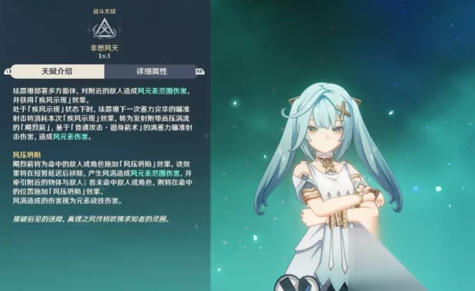 天赋解析和加点建议 元素战技“非想风天”,简单来说就是3步:1.部署多方面体造成范围风伤;2.下一次蓄力箭变成因为天赋效果蓄力时间变得更短的“飓烈箭”;3.飓烈箭发射后在命中的位置(可以是敌人或队友,也可以空放)产生“风压坍陷”效果,产生“风涡”造成风伤和小力度的聚怪效果,以及天赋带来的减风抗效果。