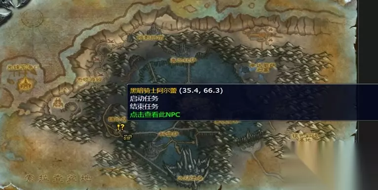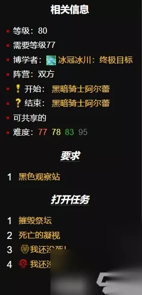 三、缝合场黑暗骑士阿尔蕾的任务线(它们从哪儿来的) 调查缝合场东部的召唤祭坛,然后返回黑色观察站,向黑暗骑士阿尔蕾汇报情况。 1、任务地点:冰冠冰川黑暗骑士阿尔蕾(35.4,66.3)