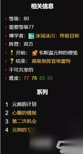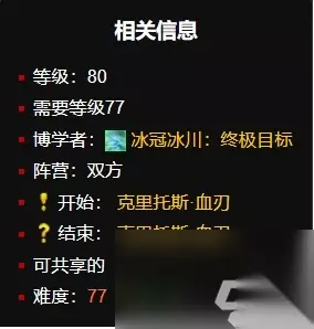 魔兽世界非常多的任务可以做,完成之后都可以获取不少的奖励和丰厚报酬,根据每个任务的复杂难度进行,今天给大家分享比较长的任务,任务数量比较多的达到了100多个,还是非常有挑战性的,它就是魔兽世界冰冠冰川140个任务,这个任务高难度,很多玩家玩到做到136/140就没任务了,其实还有的,如果你不知道的话可以看下面攻略哦。 魔兽世界冰冠冰川140个任务如何完成 备注:游戏中因为questie插件有几条任务线没收录 地图不显示npc 清任务的时候很容易忽略 之前一直卡在120多个,后面一个一个对照才清完 总共差不多150个任务,所以需要完成150个。 一、离别礼物任务线 暗影拱顶的克里托斯·血刃要你使用统御之眼控制一只被捕获的幻象观察者。 1、任务地点:冰冠冰川 克里托斯血刃 (44.1,24.5)