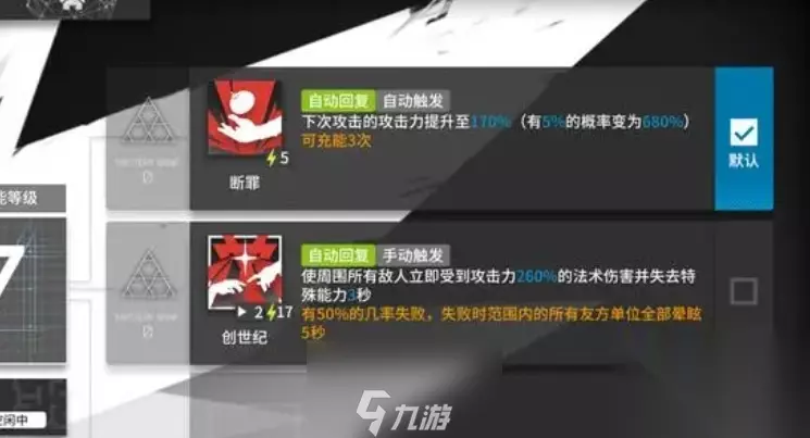 1、 第一天赋稳妥降落:断罪者的部署费用和再部署时间会小幅度减低,但是当玩家们部署断罪者之后她会眩晕10秒。这个技能可以让玩家更快速地部署断罪者,但需要注意的是她会在部署后眩晕一段时间。 2、 一技能断罪:这是断罪者的主要攻击技能,可以储存3次。释放技能后下次攻击造成的伤害会提示,并且会有5%的概率会使这次攻击伤害大幅度加强。这个技能可以让断罪者在战斗中造成更高的伤害,并且有一定的概率触发强力攻击。 3、 二技能创世纪:开启技能之后会使周围所有的敌人受到法术伤害并且失去特殊能力2秒。这个技能会有50%的失败概率,失败之后会使所有有我方干员全部眩晕5秒。创世纪技能可以对敌人造成一定的控制效果,并削弱其特殊能力,但需要注意的是技能有一定失败概率,失败后会对我方干员造成眩晕效果。