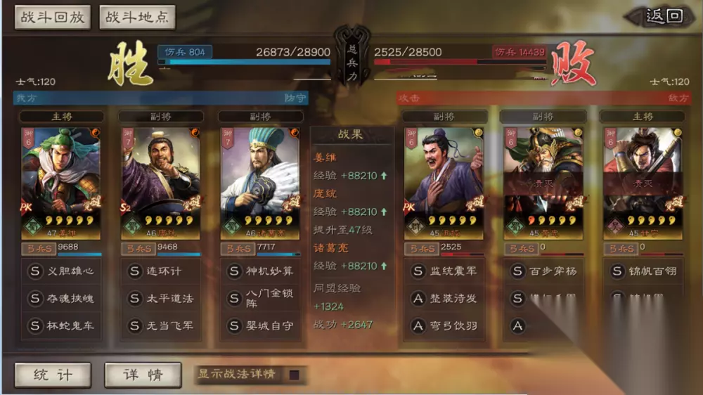 同样对战麒麟弓,对方的战法可谓豪华,草船跟军民都带上了,还是打了个平手不亏,现在版本吴枪弱势,所以打这个队伍很轻松,打几乎满红甘宁的虎臣骑全灭对手获得胜利,对战藤甲太尉盾,临机制胜的作用就显示出来了,第一回合就施加了灼烧状态,三次临机制胜输出了八千一,姜维和庞统伤害几乎一样高,对战现在最火的程关荀枪也能做到劣平。最后要提一点避免对战的队伍,各种张角盾不要打,妖星盾、诗诗盾都不要碰,绝对打不赢,现在的张角是版本之神,五雷轰顶发动率伤害量简直夸张,所以就不要去自取其辱了。