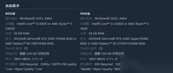 具体配置要求如下: 最低配置 操作系统:需为Windows 10/11 64位版本。 处理器:Intel Core i5 - 8400 或者 AMD Ryzen 5 3400G。 内存:16GB RAM。 显卡:NVIDIA GeForce GTX 1060(显存6GB)或者 AMD Radeon RX 590(显存8GB)。 DirectX:版本需达到12。 存储空间:至少要有100GB的可用空间,并且需要使用SSD固态硬盘;在此配置下,目标性能为1080p分辨率、30帧,FSR质量设置为“低”。 推荐配置 处理器:Intel Core i5 - 10400 或者 AMD Ryzen 5 3600。 内存:同样为16GB RAM。 显卡:NVIDIA GeForce RTX 2060 Super(显存8GB)或者 AMD Radeon RX 5700XT(显存8GB)。 存储:同样需要SSD固态硬盘;在此配置下,目标性能为1080p分辨率、60帧,FSR质量设置为“中”。