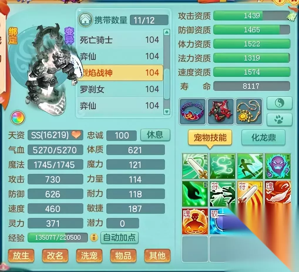 三、多段伤害变相增加恐怖几率 笔者作为一个“抽象派”神武玩家,对于多段伤害也是有自己的理解,那就是做纯血控制宠,多段伤害的输出必然拉胯,但拥有多段伤害能力的宝宝如果携带控制技能的话,那就是变现增加触发几率,那我们就扬长避短直接做成血盾控制宠。下面分享一下个人的想法,这本就是一种娱乐玩法大家也不必过分认真。 打书思路1:恐怖只对选中目标生效 烈焰斩+连击+反击+隔山打牛+恐怖,将一个单位的恐怖几率做到最大化;而反击+反制+隔山打牛则不局限于一个单位,除了自身攻击外,被反击、隔山的单位同样有机会触发恐怖效果。 打书思路2:反击+魔法反击+反震+恐怖+厄运+援助 这只宝宝拉出来之后的操作就是纯粹的血宠玩法,就是丢药和保护,通过反制、援助类技能去触发控制效果,完全不消耗行动力,同样适合魔王无名这些高输出频率的门派使用。