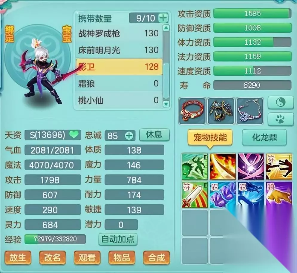 另外既然是援助宠,那跟上面提到的生命守护当然可以“梦幻联动”,反正技能都没有硬性一定要高级技能的要求,有个“高反击+小厄运”护符的话也是可以留一手生命守护。 你可能会说想着用反击触发恐怖,那别人不打它不就没用了?的确如此,但下滑的近战物理伤害和群伤又如何规避? 实战中对手也不是上帝视角,我们拉出来一只中慢速度普通外观的宝宝,是很被难判断出这个宝宝是个什么东西的,只要能控住一次,它的贡献就已经超过寻常血宠了,玩的就是一个阴。 《神武4》以上所有奇思妙想,它们在寻常的正面战场中肯定是不如三维剑气、高速蚩尤这些主流的宝宝来得强势,但在某些特定局面,当它们的功能性得以发挥的时候,将惊艳众人。