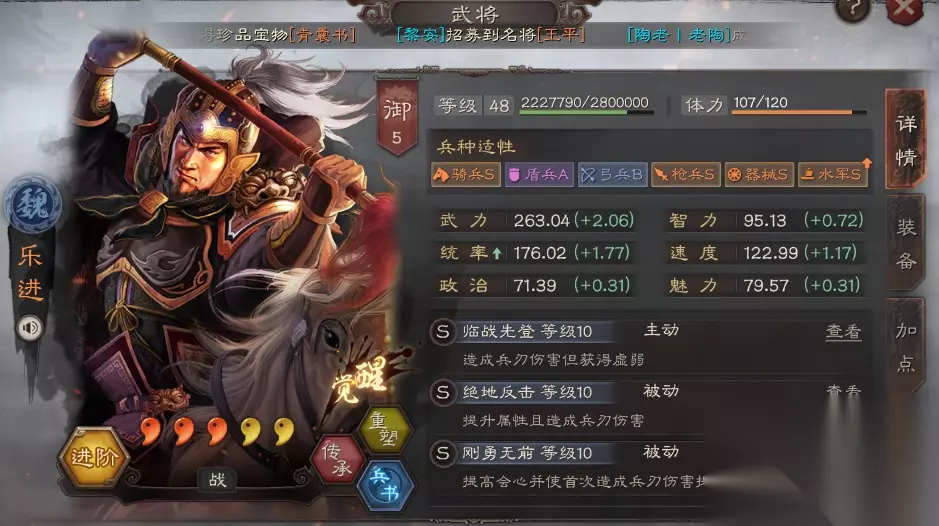 想说绝地反击、击其惰归无效的玩家,建议你游戏中试试再说,不要每次都评论说什么无效。 【治疗体系】 陷阵营:1-3回合加血 左慈:3-5回合加血 武锋阵:1/3/5/7回合加血 非攻致胜:3回合开始,治疗最低兵力 没有非攻致胜的时候,乐普盾就很稳定,而非攻致胜战法出现后,乐普盾的稳定性更强了,经常恢复5000-8000兵力。 队伍最大的缺点: 怕控制、怕诸葛亮打断,这两点是乐进最大的缺点,就像藤甲兵怕火,突击怕盛气一样。