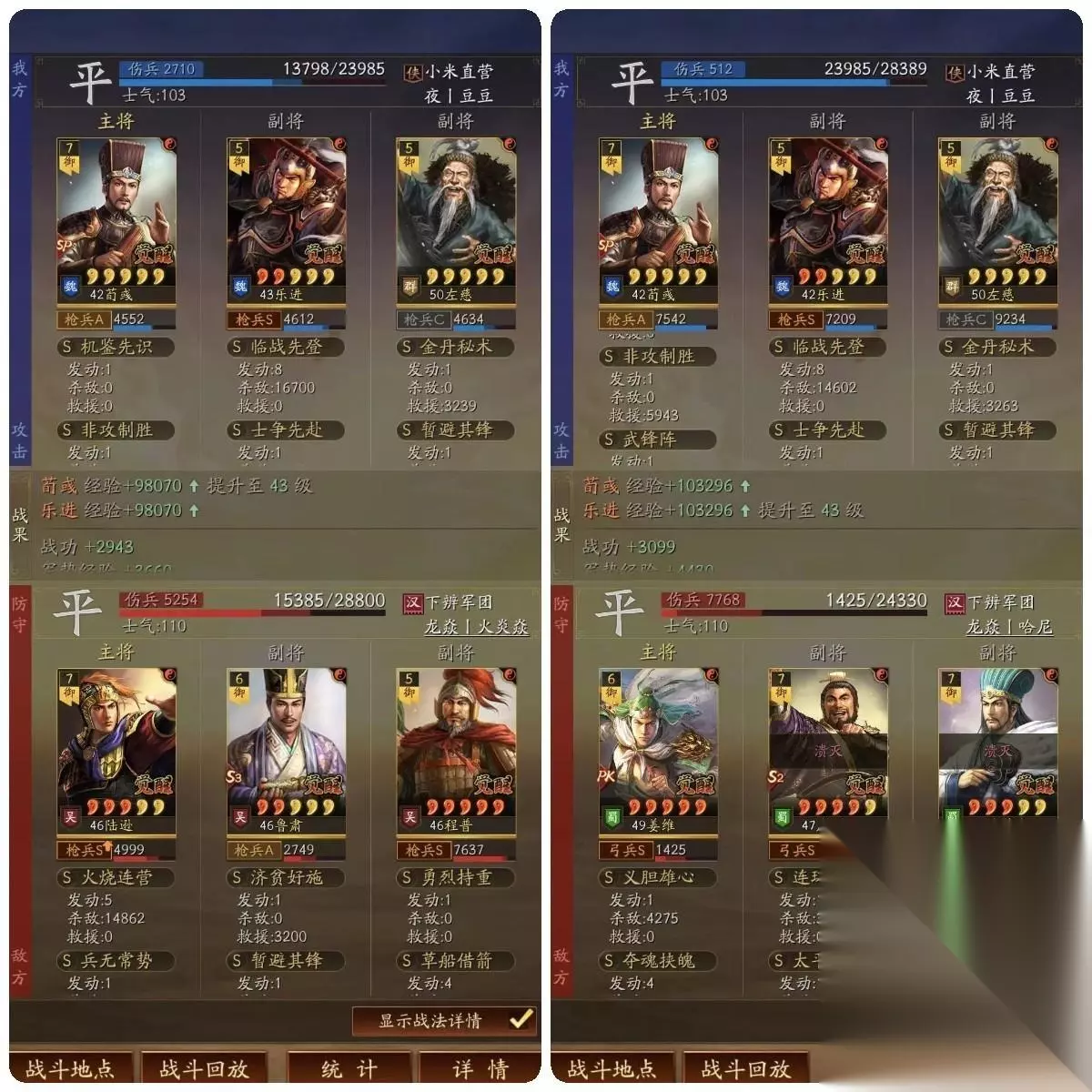 SP荀彧:非攻致胜+横戈跃马 乐进:士争先赴+文武双全 左慈:暂避其锋+武锋阵 没有曹操增伤的话,可以选择横戈跃马,前3回合降低法系伤害,防止被爆发打,3回合后直接增加兵刃伤害。