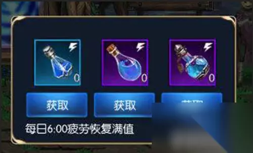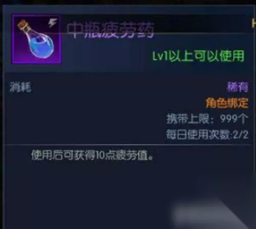 2,中瓶疲劳药:每日可使用2次,每次获得10点疲劳值。