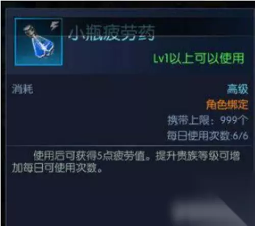 DNF疲劳药水介绍 1、小瓶疲劳药:每日可使用6次,每次获得5点疲劳值。