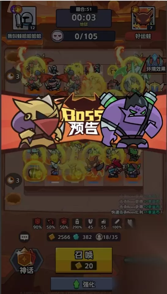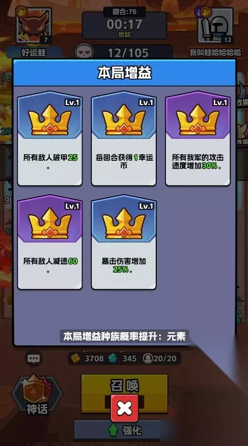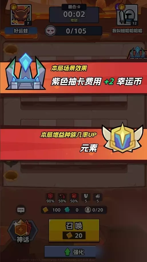 2 随机环境效果和增益效果 开局会有个随机负面buff,比如抽卡费用变高、怪物掉落变少、怪物抗性变强等等,让人头疼。但别担心,也有随机增益效果,比如动物、元素、人类等种族的几率UP,选好了,战斗会轻松不少。关键是在10、20、30、40、50回合,打赢Boss就能选增益效果,没选好的还能用幸运币刷新。