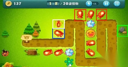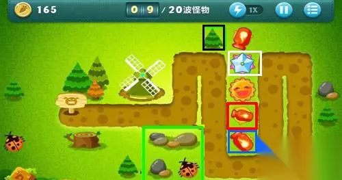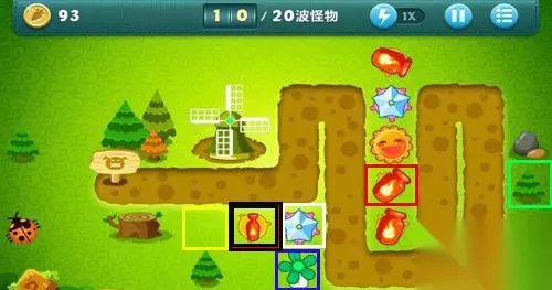 第六步,消灭第9波怪后,玩家需要把红色方框中的 汽油瓶子升为顶级。 第七步,第10波怪血量很大,玩家需要一边消灭敌人,一边把 蓝色方框中的风扇升为顶级。 第八步,第10波怪消灭后,金钱累积到了1045;在 白色方框中建造1个冰冻星星并且升为顶级,最后在黑色方框中建造1个 汽油瓶。 第九步,消灭第11波怪,把黑色方框中的汽油瓶升为顶级。 第十步,消灭第12波怪后,在黄色方框内再建造1个 汽油瓶,然后摧毁绿色方框中的障碍物。 第十一步,把黄色方框中的汽油瓶升为顶级,然后在摧毁 荷兰风车。