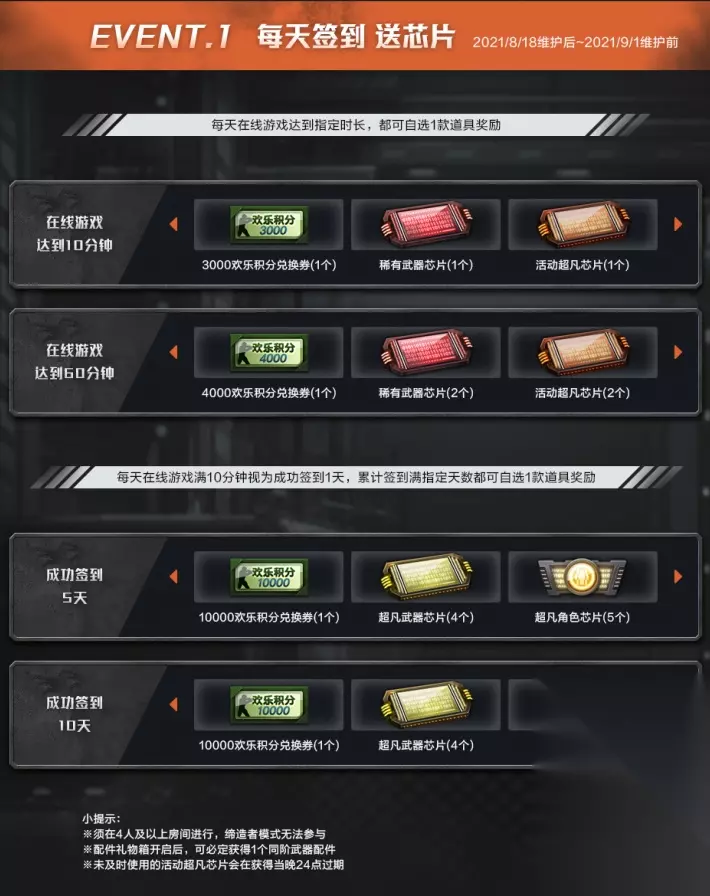 活动介绍: 每天签到送芯片 活动时间:8月18日至9月1日 活动期间,每天在线游戏时长达到10分钟和60分钟,都可分别解锁一款自选道具奖励,自选奖励选项中包含欢乐积分兑换券、稀有武器芯片、活动超凡芯片、特级强化材料、配件礼物箱五种不同道具,玩家可根据自己需求自行选择。 而每天在线游戏满10分钟视为签到一天,累计签到达到5天和10天,还可解锁具有更高价值的自选道具奖励哦!想要获得大量欢乐积分吗?想要免费入手超凡武器芯片和超凡角色芯片吗?想要获得大量强化材料和高阶配件吗?那么这个活动可千万不要错过呦!