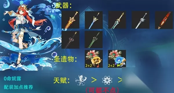 妮露配装: 圣显之钥肯定是最好的,然后是绿剑,由于不存在其他生命单手剑,所以优先选精通单手剑,如苍古自由之誓,铁峰刺,西弗斯的月光,东花坊时雨,暗铁剑…… 圣遗物选择2千岩+2花海即可,也可以用2千岩/花海+2精通。 2千岩+2花海与2生命+2精通的差距极小,大家有哪套用哪套就可以。 不推荐用4乐园,因为妮绽队里不只是妮露触发绽放,心海/芭芭拉也会触发,不仅如此,四个人每个人都有机会去触发绽放,因此要考虑多堆生命,给全队带去增幅。 天赋方面,E>Q>A,可以全都不点,因为打伤害靠的是种子。 心海/芭芭拉建议带海染套的 生 生 生/治,武器带祭礼书,天赋先E后Q。 剩下两个草队友里有一个需要带草套,另一个带教官套即可。