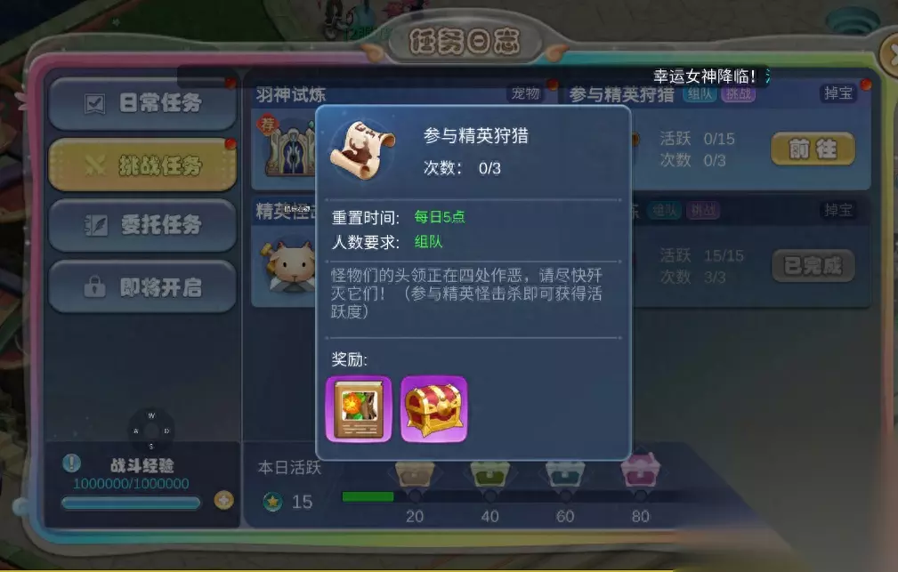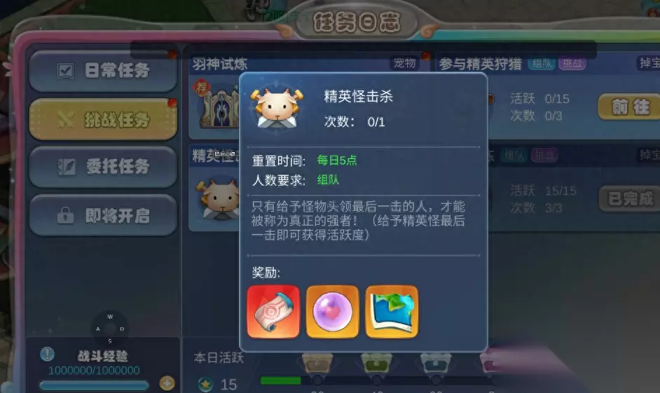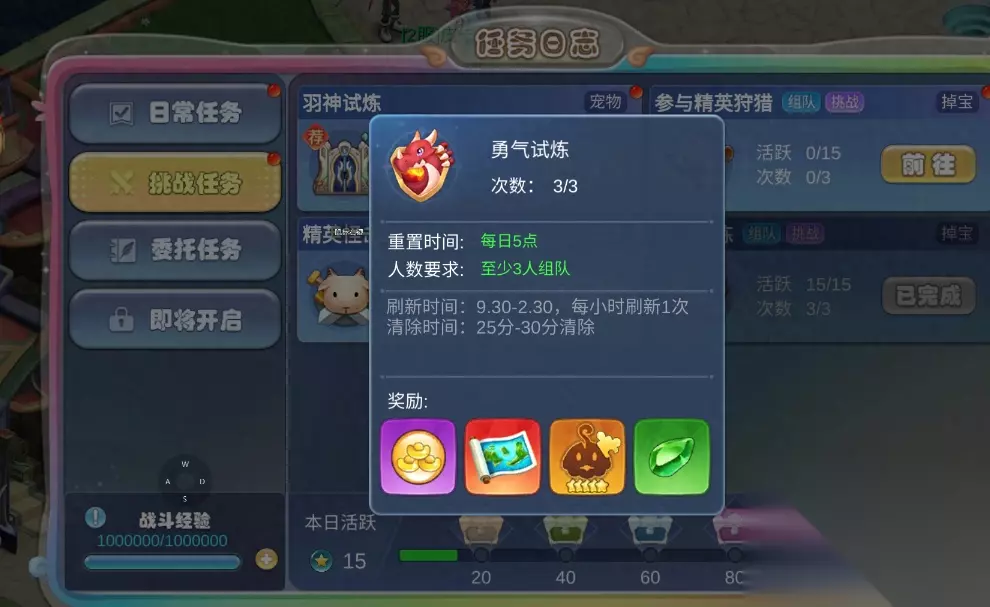 精英怪击杀是和上个任务精英首领相同的,但是他对于我们自己的练度有关,我们能力越强,打出的伤害越高,最后一击的概率也就越大。奖励也是非常丰富,例如强化卷轴、祝福石英、宝藏图碎片 勇气试炼:队伍四人组队任务