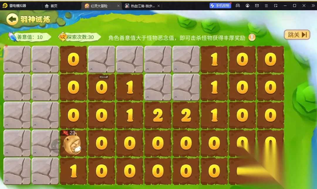 首先是羽神试炼,这个游戏的玩法和我们在很早之前,比如win7电脑的系统上经常接触到的一款游戏:扫雷。当我们扫出来是0时,意思就是以0为中心的九宫格的其余八个方块里是安全没有雷的,同理扫出来一二三。