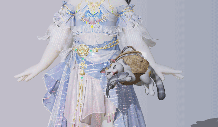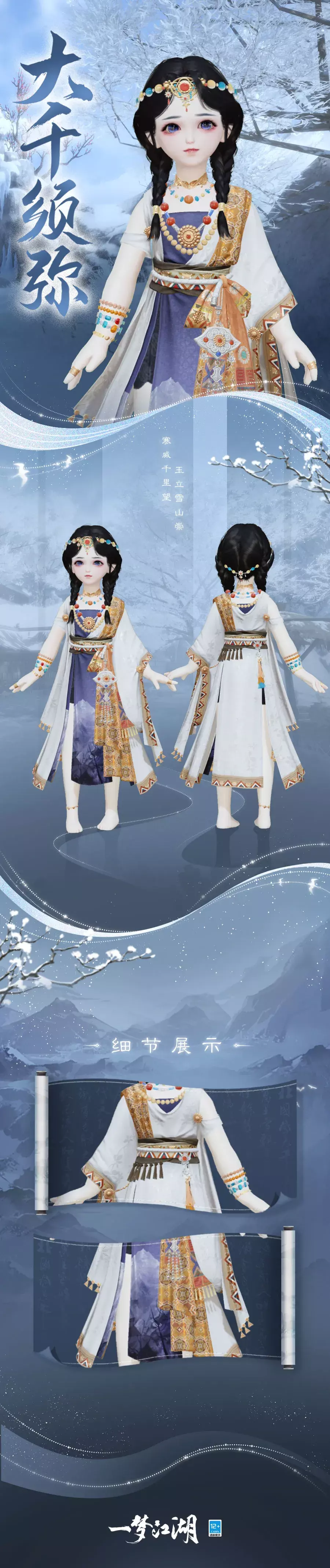 千山覆白雪,浮云萦霞光。大师傅循着梦中偶得,将日出须弥的神山盛景描绘下来,构成时装·大千须弥的唯美的意境与配色。