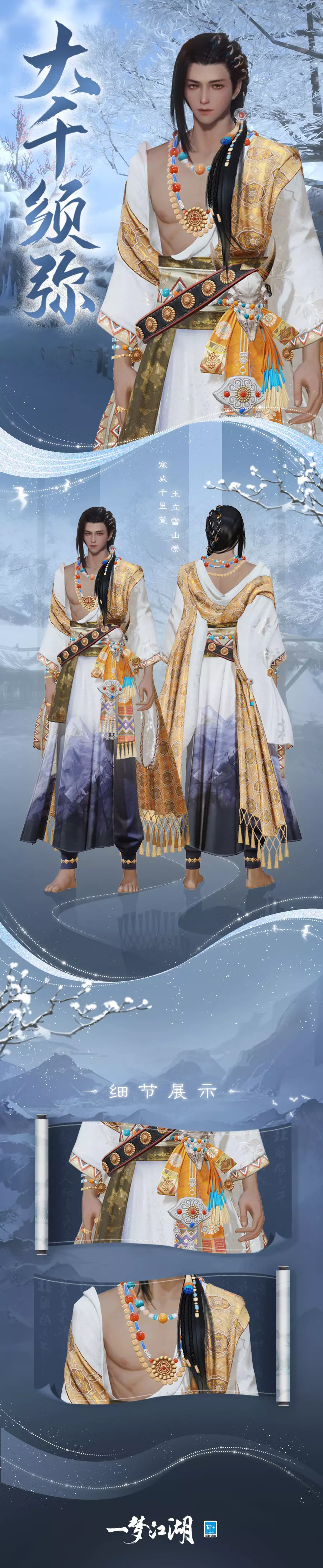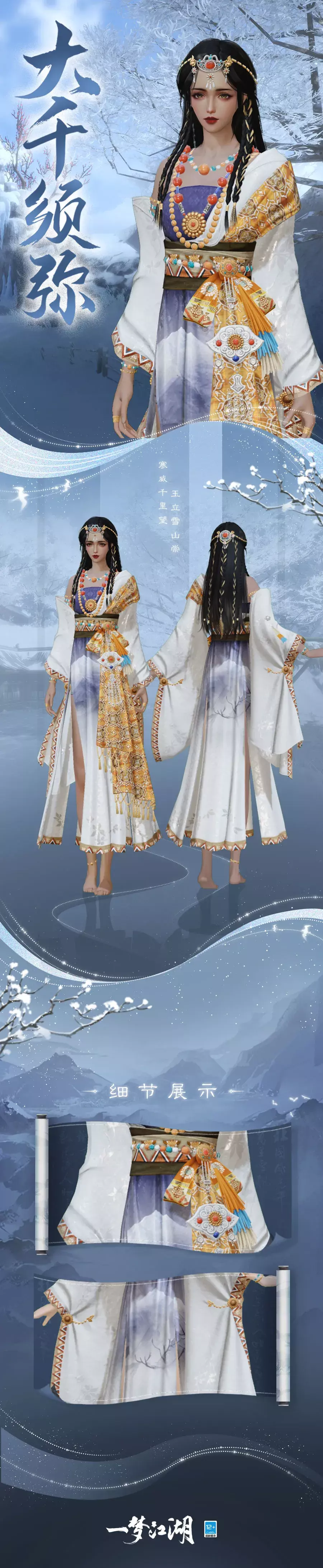 一袭白袍拟堆琼积玉的空灵雪域,金色披巾叠在裙间,仿佛旭日金光洒落在黛蓝山脊,沉稳大气的金黛白三色相辅,刻画出如须弥山一般的旷达境界。