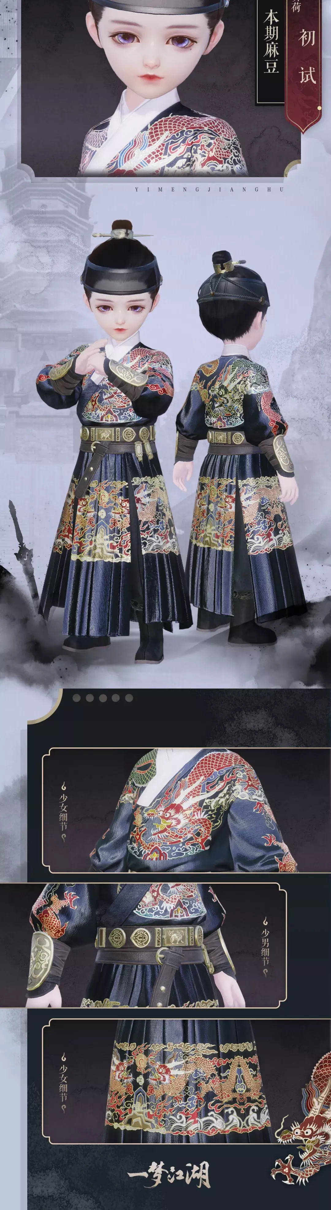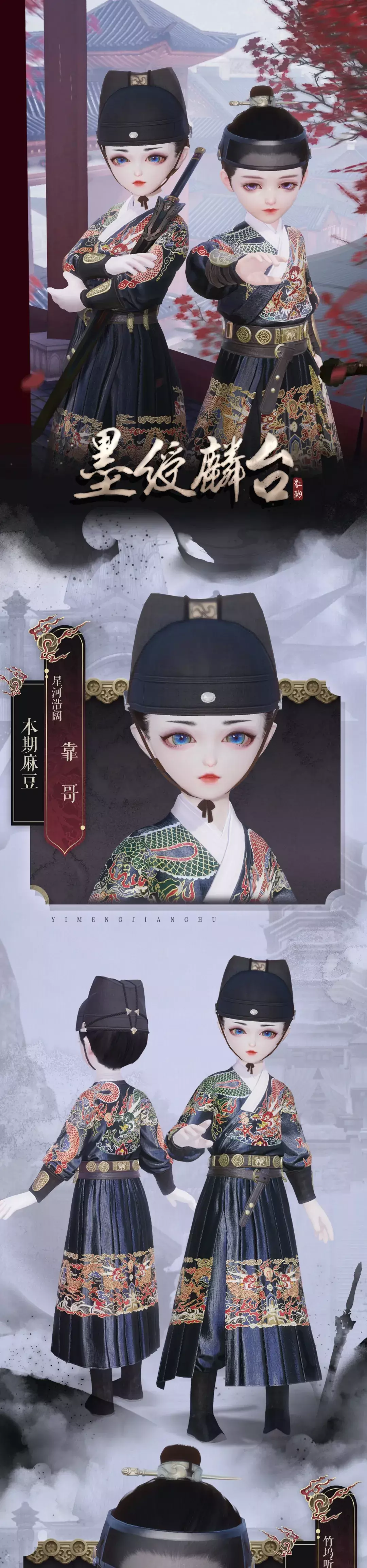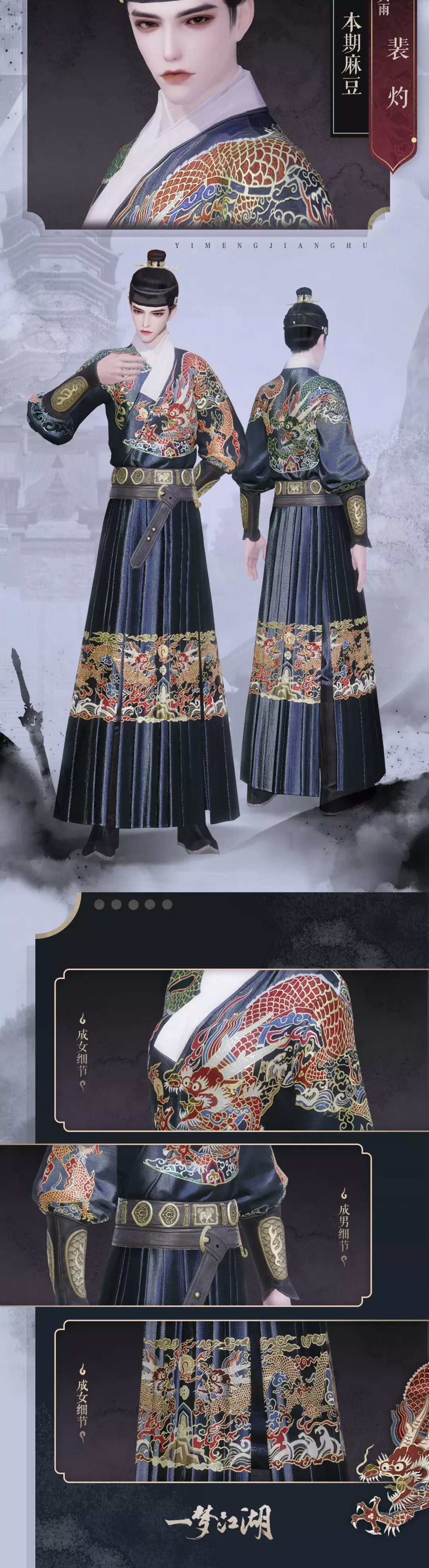 龙飞在天随百雷,蟒衣玉带晏清陪。少侠们身着此套墨绶麟台,像是行踪诡秘的神秘侠客。墨色的衣衫质感十足,金丝绣成的蟒纹栩栩如生。发型采用明代网巾设计,袖口采用皮质材料,质感满分,更显尊贵霸气!