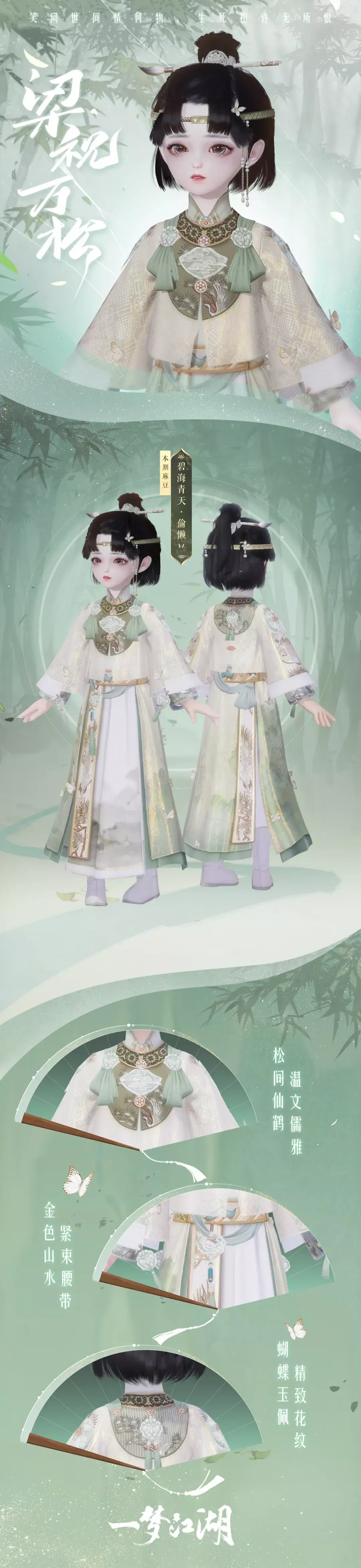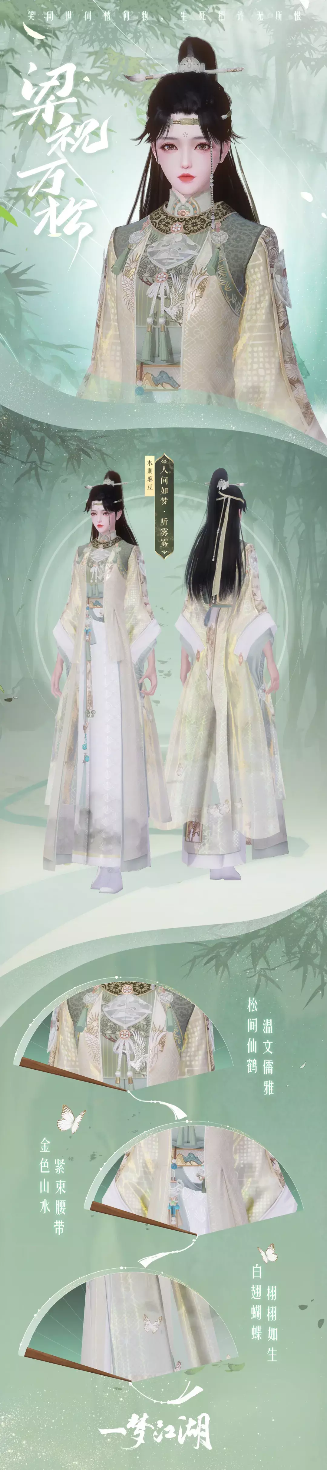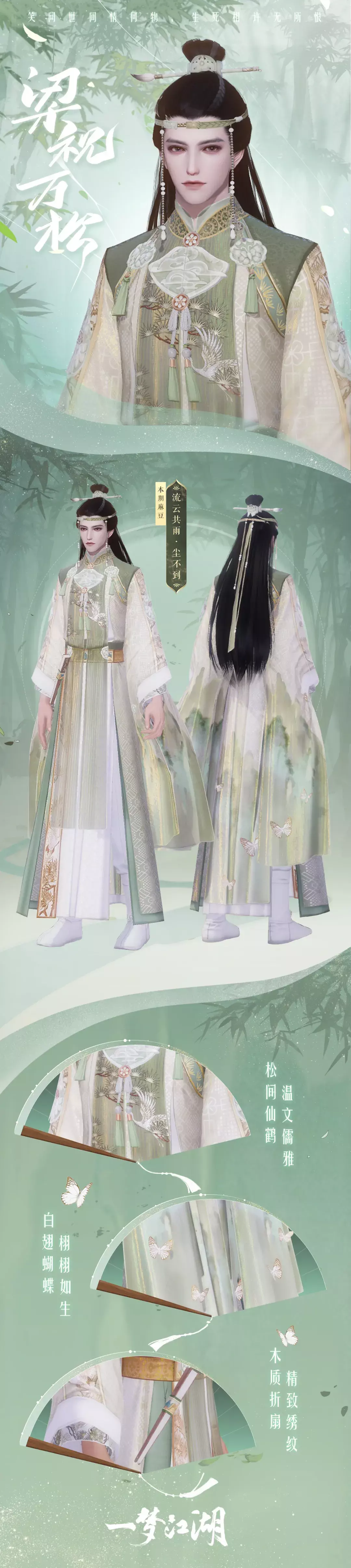 这便是梁祝·万松中男装佩戴折扇、女装腰挂玉佩的由来。袖口的蝴蝶是化蝶起舞的梁山伯与祝英台,而那一身墨绿绘出了秀丽的山间景色,也描绘了见证二人爱情的万松书院。