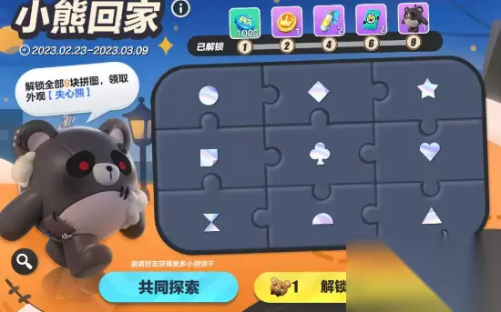 蛋仔派对失心熊皮肤获得方法指南 1、活动期间,完成成就任务或者邀请好友“共同探索”,就能获得【小熊饼干】;使用【小熊饼干】可以解锁拼图,解锁全部9块拼图,可以领取外观【失心熊】 2、邀请好友“共同探索”最多可获得5个小熊饼干;完成【熊途漫漫】活动的成就任务,还可以额外获得4个小熊饼干,使用小熊饼干解锁全部9块拼图,即可领取【失心熊】外观 3、【失心熊】特别活动界面即将开放,参与活动还可领取专属动作“啃”哦 以上内容对蛋仔派对失心熊皮肤获得方法指南作出了最全的解析,简化到每一个步骤每一处细节,这款游戏的其他任务攻略这里也都有,有任何问题都能来这里查找攻略,真正专业的老牌游戏攻略玩家,记得关注哦。