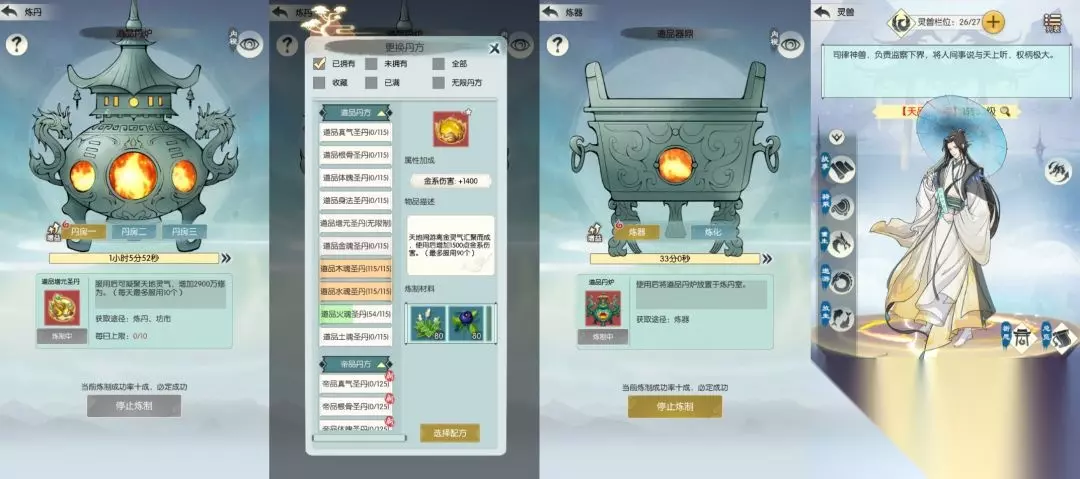 (三)秘宝属性 秘宝拥有基础的属性和特殊的被动效果。基础属性由不同数量的四维和五行属性组成,品阶更高属性的数量越多。 被动效果是额外附加属性,完成指定的提升条件可以对其进行提升。 (四)秘宝凝练 秘宝可以使用日月精粹和其他材料进行凝练,提升基础属性,日月精粹可以通过寻宝或仙盟商店、仙元楼、灵玉楼购买获得。更高品阶的秘宝可以凝练的次数更多。 (五)秘宝升星 秘宝可以使用洪荒精魄、本秘宝碎片和秘宝精华进行升星,提升基础属性和被动效果。 洪荒精魄可以通过寻宝或仙盟商店、仙元楼、灵玉楼购买获得,秘宝精华可以通过秘宝碎片分解获得。 (六)秘宝分解 秘宝激活之后,额外的碎片可以进行碎片分解,获得等品质的精华。 精华可以用于秘宝的升星 (友情提示:秘宝碎片既可以用于本秘宝升星,也可以用于分解获得精华,所以分解时道友们需要谨慎选择~) 后续版本会增加游戏内的秘宝材料日常产出,道友们敬请期待~ 【场景地图重做】 (一)洞府 过去的洞府界面过于强调功能的堆砌,没有修仙洞府的画面感,所以我们本次将洞府界面进行了重绘,分版块的描绘洞府中的各种功能。炼丹、炼器界面我们进行了重绘,侧重于炼制时的效果展现,选择丹方和图纸的界面也进行了优化,更加清晰易查。灵兽界面也进行了图标的重新排布,与后面历练的图标形式保持一致。 (友情提示:内务就是原先的洞府生产哦~)