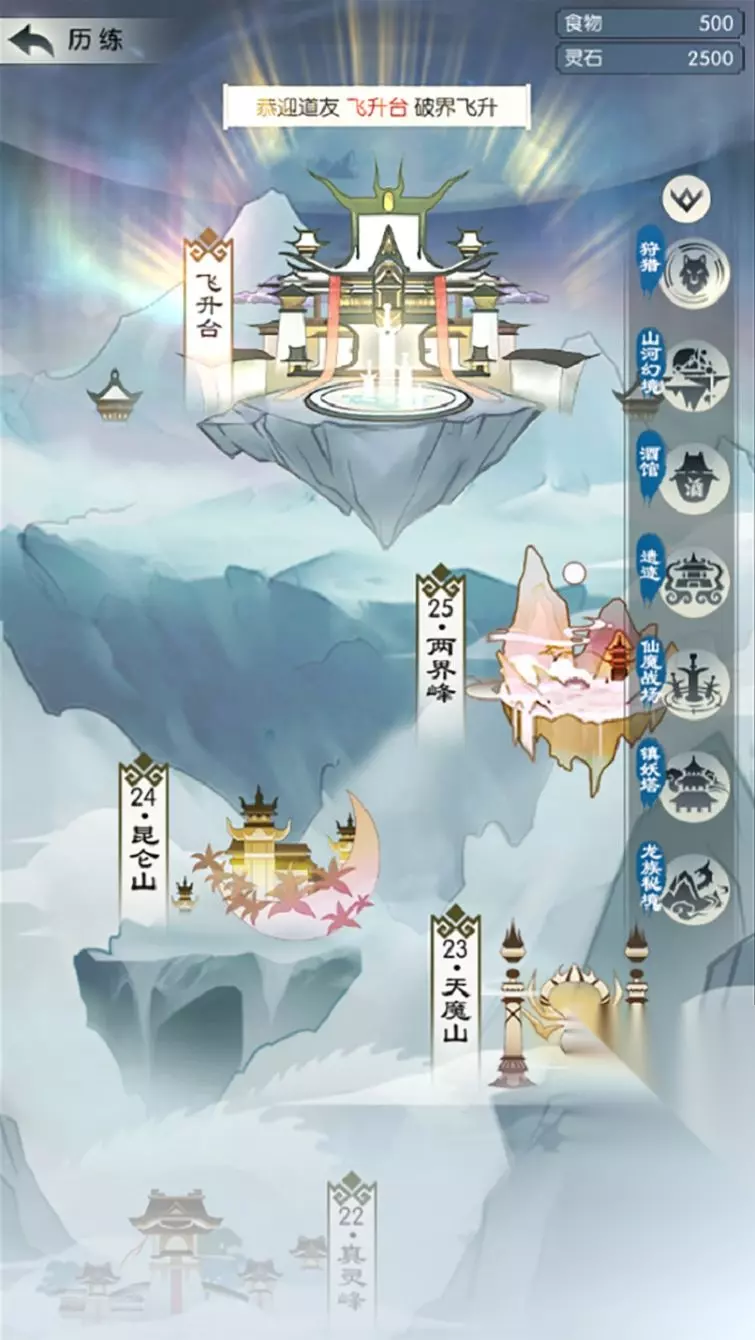 (二)人间历练 为了给新手道友更好的飞升体验,我们将人间的历练场景进行了修改,以25关闯关和飞升台为主,将原先的其他玩家放到了右侧,重绘了按钮,同时可以进行折叠。