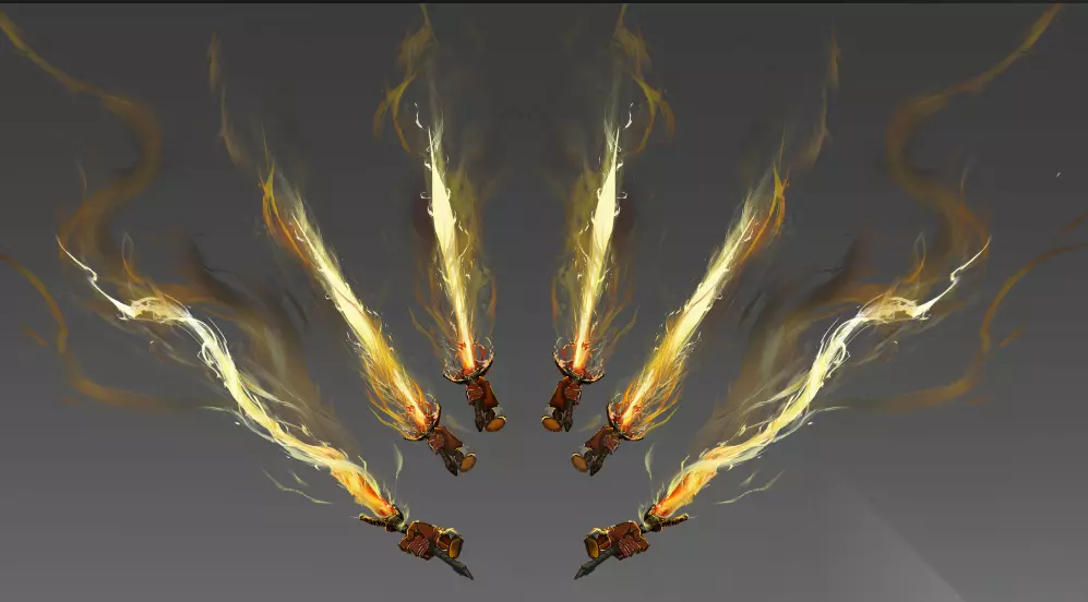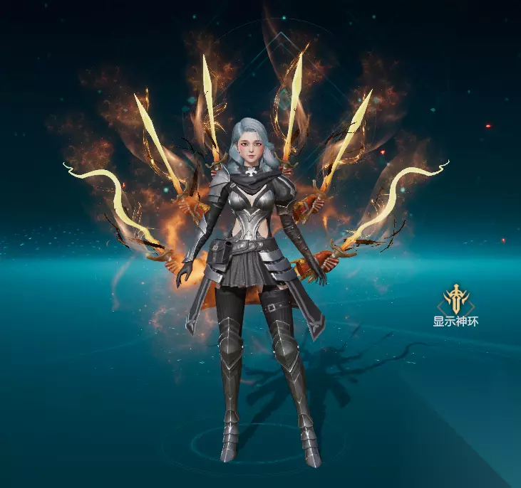 【光明神臂上身示意图】 装备上光明神臂后,玩家身后会延伸出重装的六只单臂,它们分别紧握六把璀璨夺目的光刃。这些光刃散发着烈焰般的火光,不仅能够延续持有者的基础生命值,还能为勇士们提供攻击力和防御力的强力BUFF。