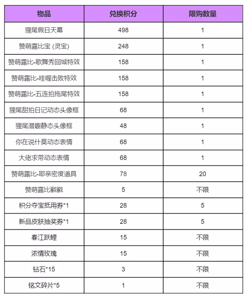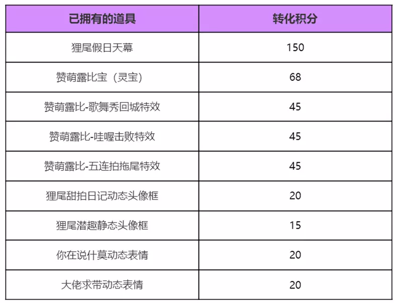 5、对对碰积分:可用于在兑换商店兑换狸尾假日联动天幕、赞萌露比宝联动灵宝套装等奖励;积分可通过拆福袋后徽章对对碰、徽章三连、徽章全清、或者已有道具转化(见第7条)等途径获得,其中增加积分规则如下:
