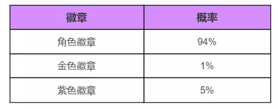 4、抽奖概率:角色徽章:94%;金色徽章:1%;紫色徽章:5%