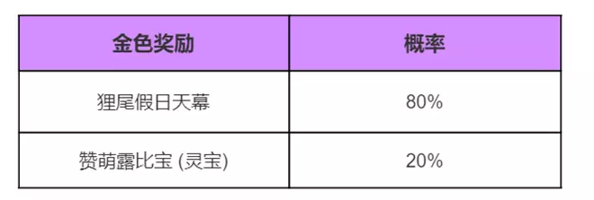 活动奖励:狸尾假日联动天幕、赞萌露比宝联动灵宝套装、回城特效、击败特效、拖尾特效等。