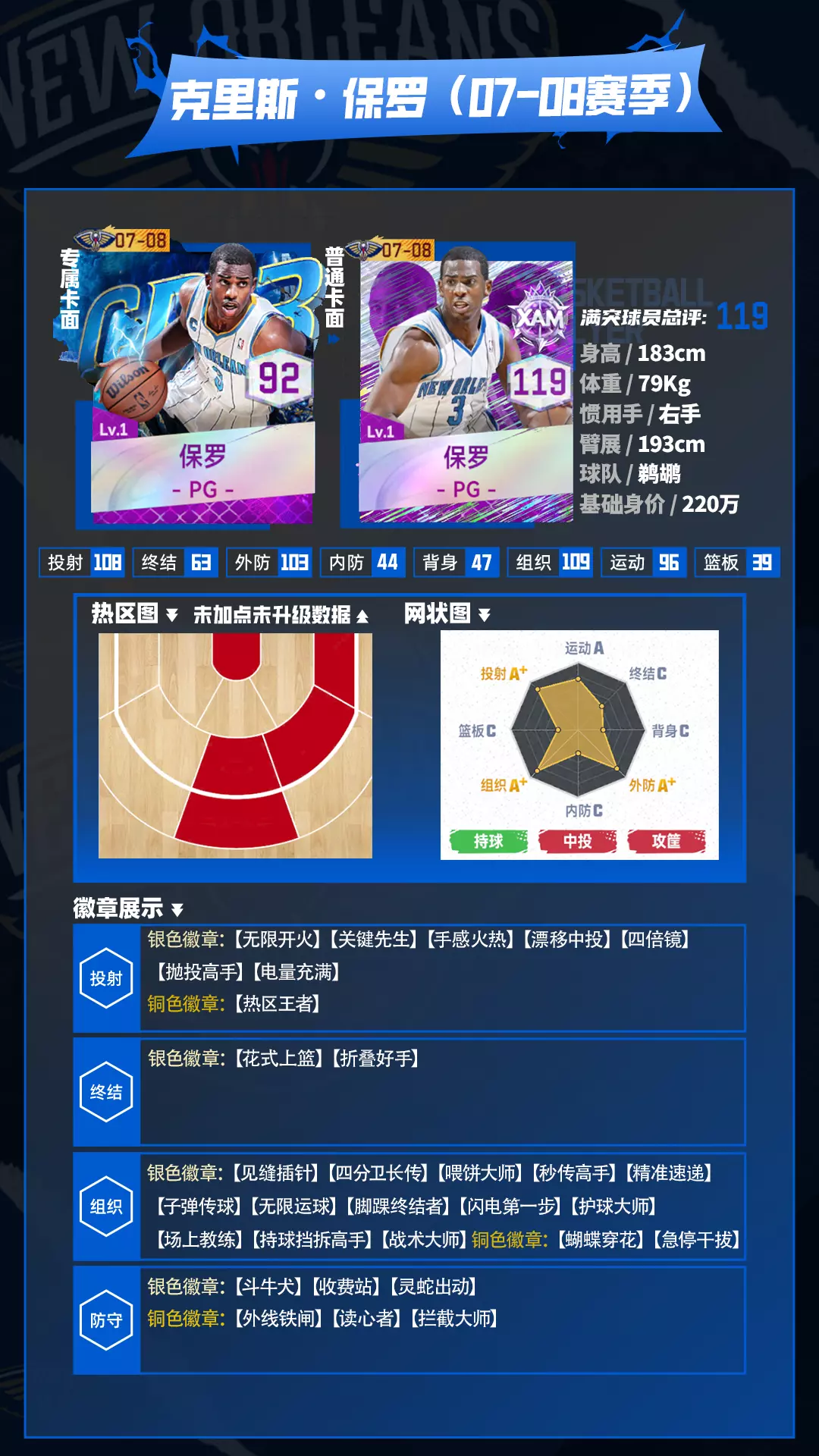 满突满点119的控球能力使他无论面对怎样的对手都能稳定控球,策动进攻,而在防守上(满突满点113分)S级别的外防评分,即使只有5枚防守徽章也让保罗能够他成为外线防守的顶级屏障!