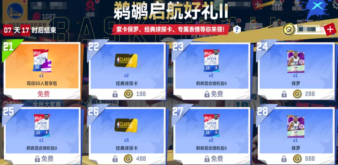 商城新增经典球探卡池礼包,超值获取大量经典球探卡!更有鹈鹕队限定队徽等你获取!