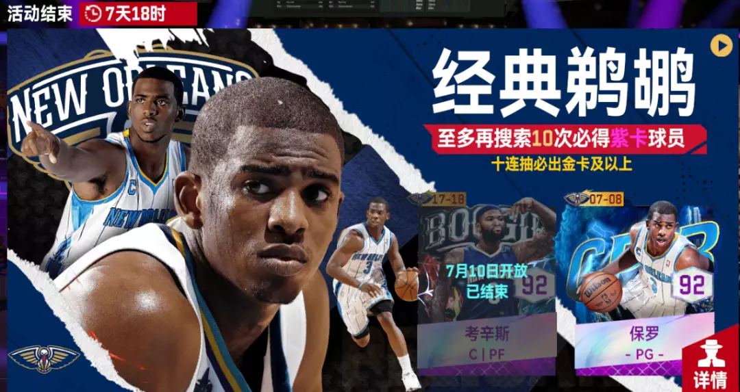 活动期间,可使用经典球探卡和G币在【经典鹈鹕】卡池中,招募当期经典紫卡球员和全部经典金卡球员。 单抽118G币,首次十连必得紫卡球员!每搜索20次至少获得1名紫卡球员。十连必得金卡球员(仅限十连)搭配超值礼包,和心仪的球员更近一步!