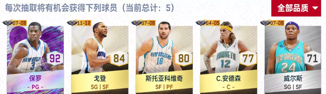 本周可抽取鹈鹕经典紫卡为保罗,经典鹈鹕金卡;埃戈登、佩贾、C.安德森 、威尔斯。